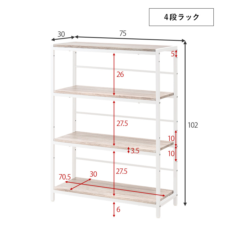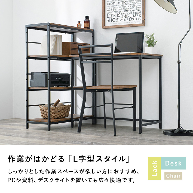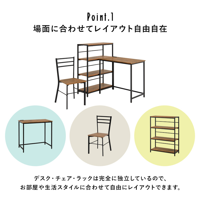 デスク・チェア・4段ラックの3点セット。収納力の高いラック付きデスクとして使ったり、別々にシリーズ家具としてコーディネートしたりとレイアウトを変えられます。