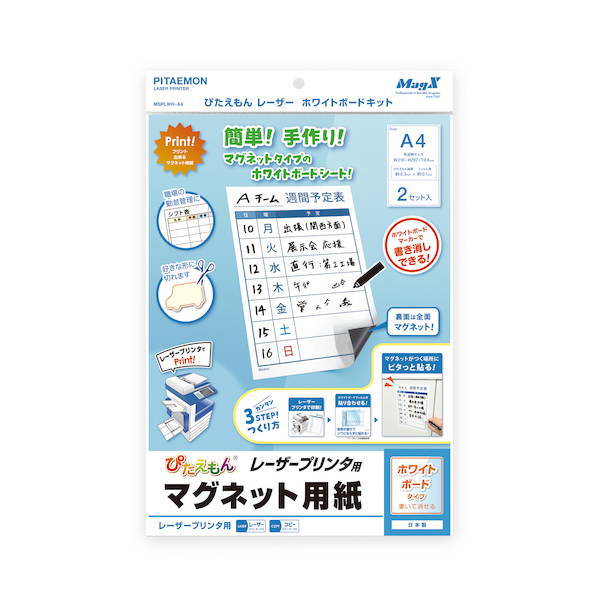 プリンタで直接印刷できる極薄マグネット用紙、「ぴたえもん」シリーズ。●オリジナルのホワイトボードを自由に作成。●付属のホワイトボードフィルムを表面に貼れば、ホワイトボードマーカーで書き消しできます。