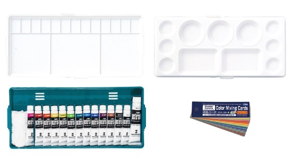セット内容:●138×300×35mm(収納時)●13色11mlチューブ各1本+ホワイト20mlチューブ1本 ●混色カード ポスターカラー用120色、パレット2枚、ミニタオル付
