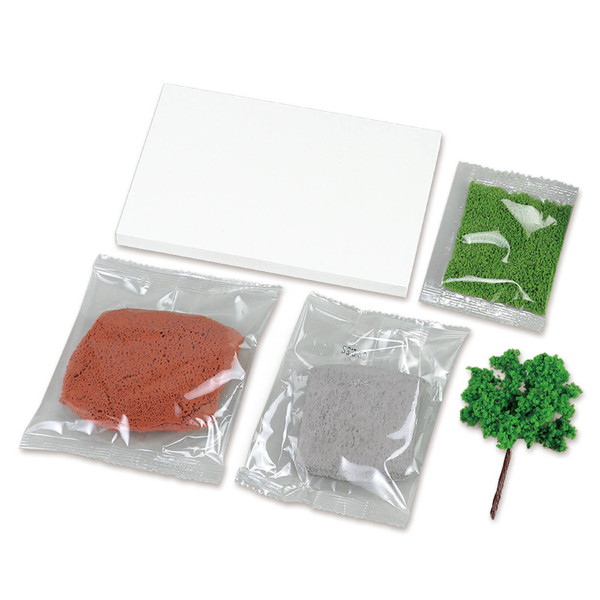セット内容:ジオラマ粘土ライトブラウン(30g)ベーシック×1、ジオラマ粘土グレイ(30g)×1、白色ベース100×150×10mm×1、ジオラマ模型広葉樹1/50×1、ジオラマスポンジ2g(グリーン)×1
