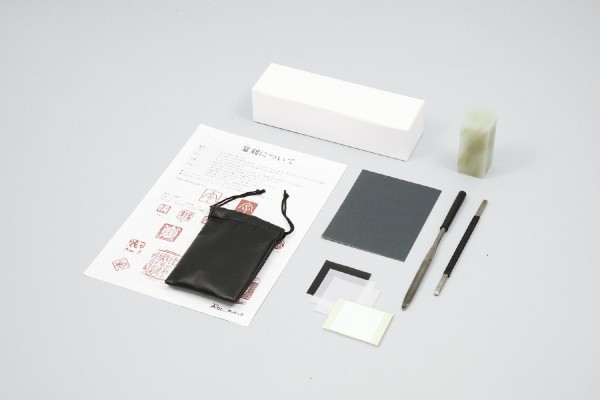 セット内容:高蝋石、印刀、やすり半丸中目/鬼目、てん刻字体説明書、レザー調小袋、耐水ペーパー、カーボン紙、トレーシングペーパー、つやだし用トレーシングペーパー、てん刻シール