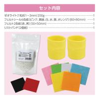 セット内容:ゼオライト(200g)×1、フェルトシール6色組(ピンク・黄緑・白・水色・黄・オレンジ)×1、フェルトシール2色組(赤・黒)×1、刺繍糸5色組(白・黄・赤・緑・水)×1、リストバンド2個組×1