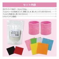 セット内容:ゼオライト(200g)×1、フェルトシール6色組(ピンク・黄緑・白・水色・黄・オレンジ)×1、フェルトシール2色組(赤・黒)×1、刺繍糸5色組(白・黄・赤・緑・水)×1、リストバンド2個組×1