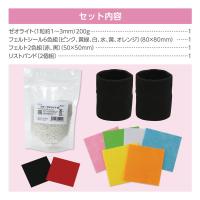 セット内容:ゼオライト(200g)×1、フェルトシール6色組(ピンク・黄緑・白・水色・黄・オレンジ)×1、フェルトシール2色組(赤・黒)×1、刺繍糸5色組(白・黄・赤・緑・水)×1、リストバンド2個組×1