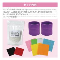 セット内容:ゼオライト(200g)×1、フェルトシール6色組(ピンク・黄緑・白・水色・黄・オレンジ)×1、フェルトシール2色組(赤・黒)×1、刺繍糸5色組(白・黄・赤・緑・水)×1、リストバンド2個組×1