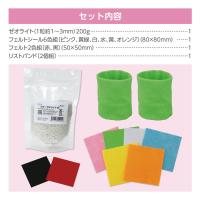 セット内容:ゼオライト(200g)×1、フェルトシール6色組(ピンク・黄緑・白・水色・黄・オレンジ)×1、フェルトシール2色組(赤・黒)×1、刺繍糸5色組(白・黄・赤・緑・水)×1、リストバンド2個組×1