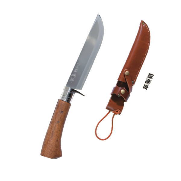 狩猟解体、魚捌き、蔓・ロープの切断、包丁の代わりとして、山懐を満喫する必需品耐摩耗性に優れ粘り強い青紙2号を割込んだ刀身、携行性の良い革鞘と、使用後の保管を兼ねた木製鞘をお選びいただけます。