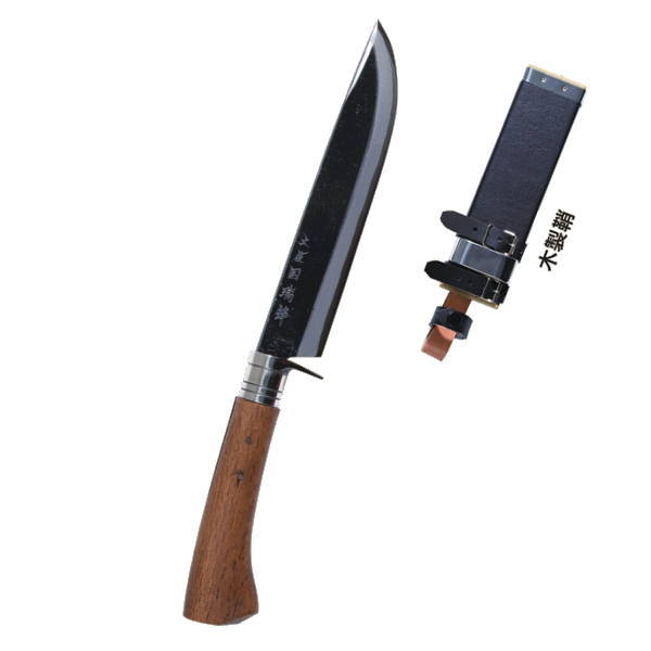 狩猟解体、魚捌き、蔓・ロープの切断、包丁の代わりとして、山懐を満喫する必需品耐摩耗性に優れ粘り強い青紙2号を割込んだ刀身、携行性の良い革鞘と、使用後の保管を兼ねた木製鞘をお選びいただけます。