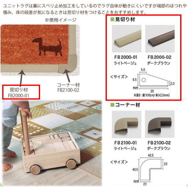 ユニットラグはそのまま置くだけでもご使用いただけますが、端部のほつれや傷み、床との段差が気になる時は、別売りの見切り材とコーナー材のご使用をおすすめします。