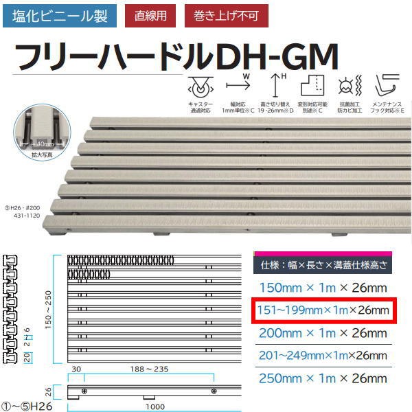 ミヅシマ 塩化ビニール製 フリーハードルDH-GM 431-1110 H26・#151〜199 幅151〜199mm×長さ1m×溝蓋仕様高さ26mm