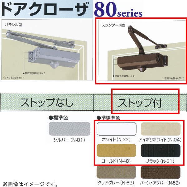 日本ドアチェック製造 ニュースター ドアクローザ 182 スタンダード型 ストップ付 アイボリホワイト /ホワイト /ブラック /ゴールド