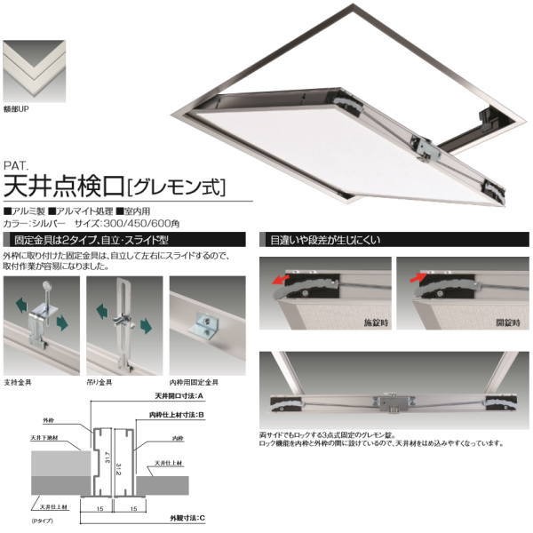●内枠を3点で固定するグレモン錠を採用。外枠・内枠の目違いや段差が生じにくい天井点検口です。