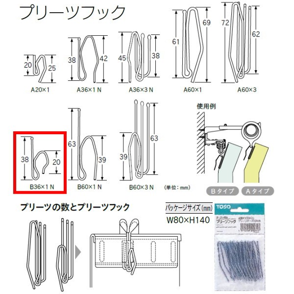トーソー プリーツフック A36×3N 50mmテープAタイプ用 スチール 10本入 673639×10パック