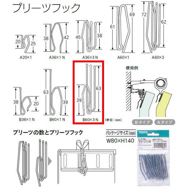 トーソー プリーツフックB60×3N 75mmテープBタイプ用 スチール 10本入 673677×10パック