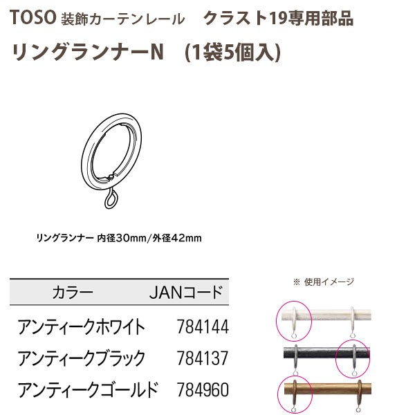 トーソー 装飾カーテンレール クラスト19部品 リングランナーN 1袋5個入 アンティークホワイト/ アンティークブラック/ アンティークゴールド どれか