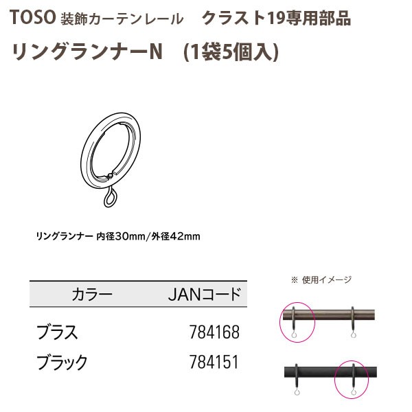 トーソー 装飾カーテンレール クラスト19部品 リングランナーN 1袋5個入 ブラス/ ブラック どちらか