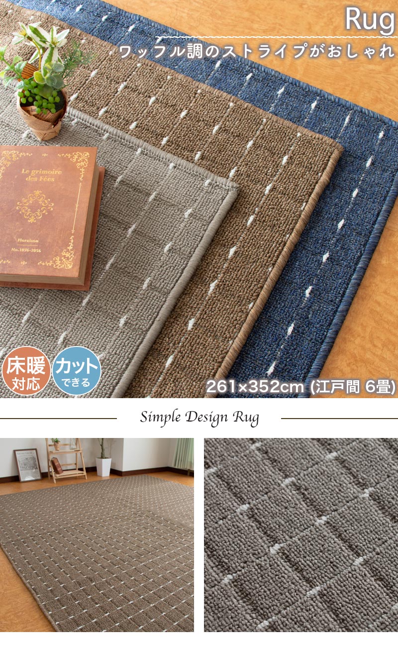 春クーポン実施中 ラグ カーペット 江戸間 6畳 261×352 ストライプ シンプル 無地 フリーカット 6帖 ラグマット おしゃれ 平織り 絨毯