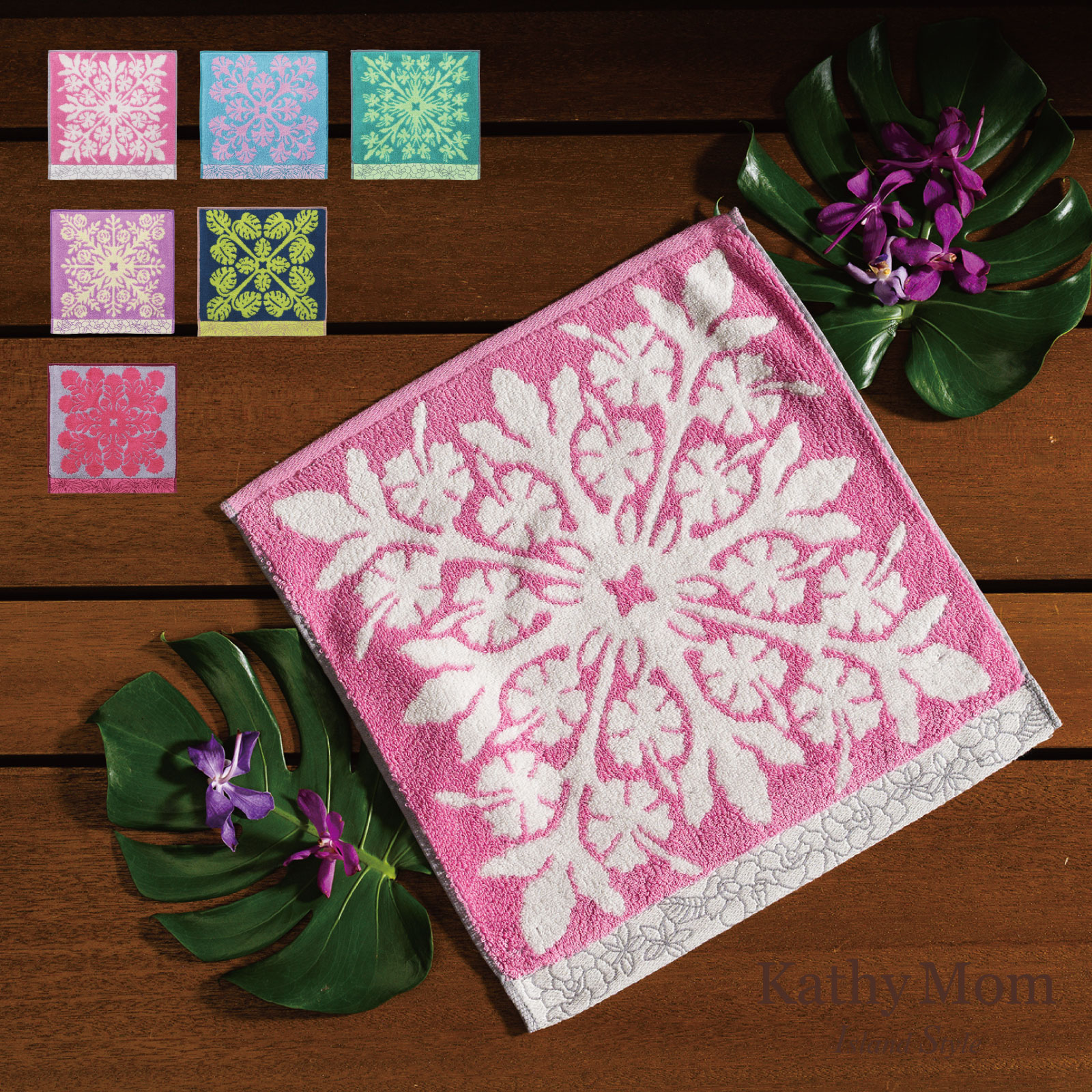 ハワイアンキルト作家、キャシー中島さんプロデュースの、ハワイの代表的な植物をモチーフにした、ふんわり柔らかなハワイアンキルト柄ミニタオルです。