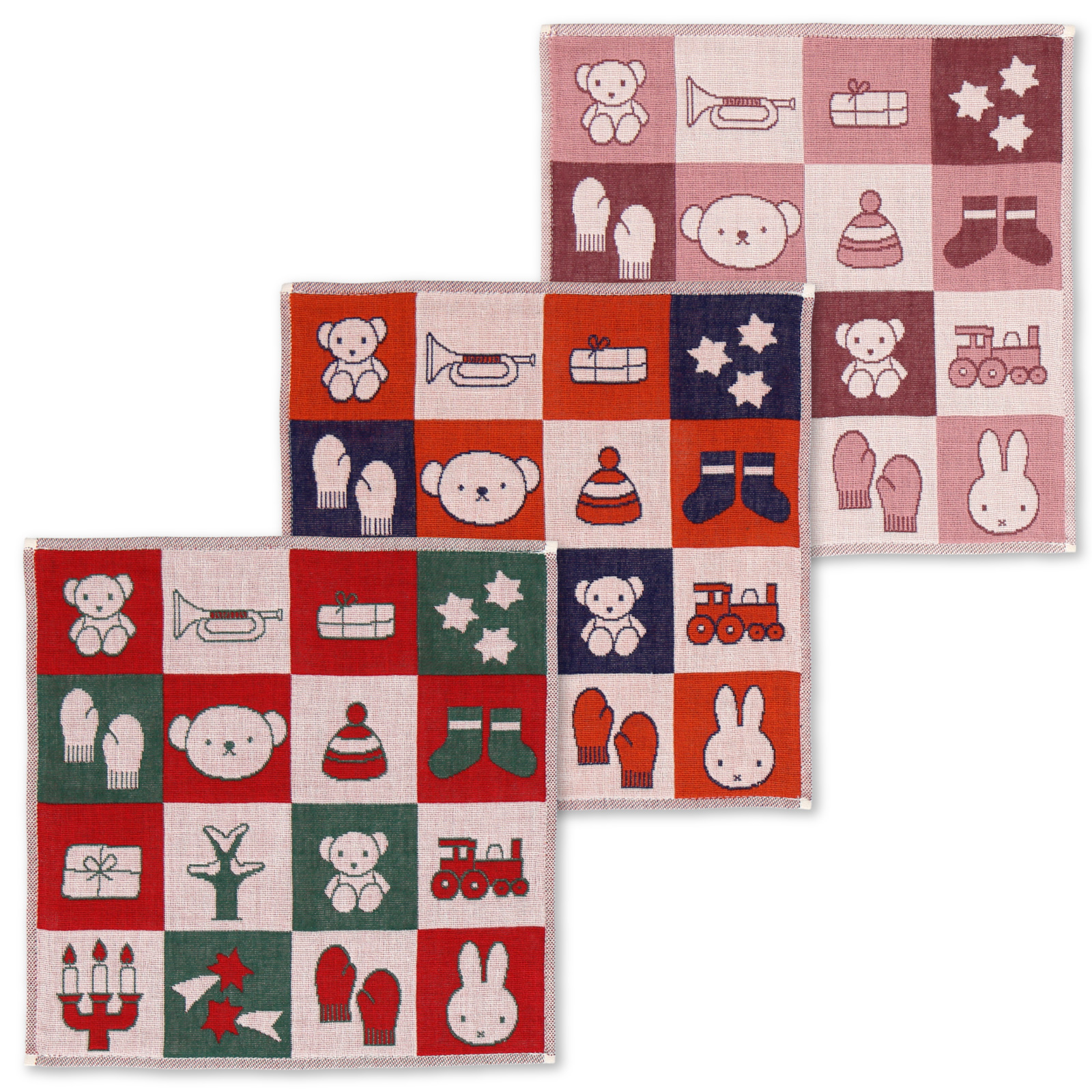 ミッフィー、ボリスと手袋やろうそく、おもちゃなどが並んだホリデーシーズンにぴったりなデザインの3重ガーゼハンカチ。