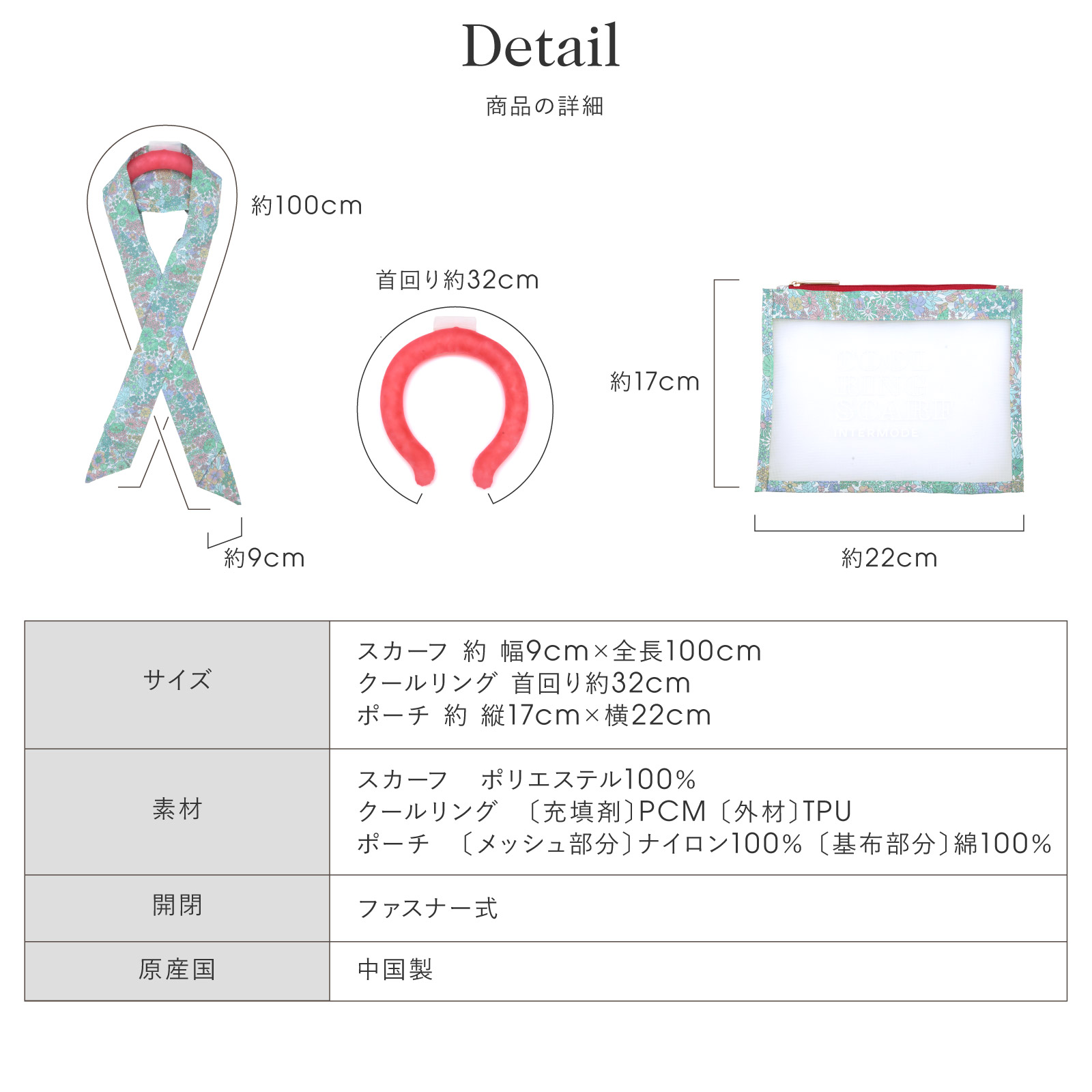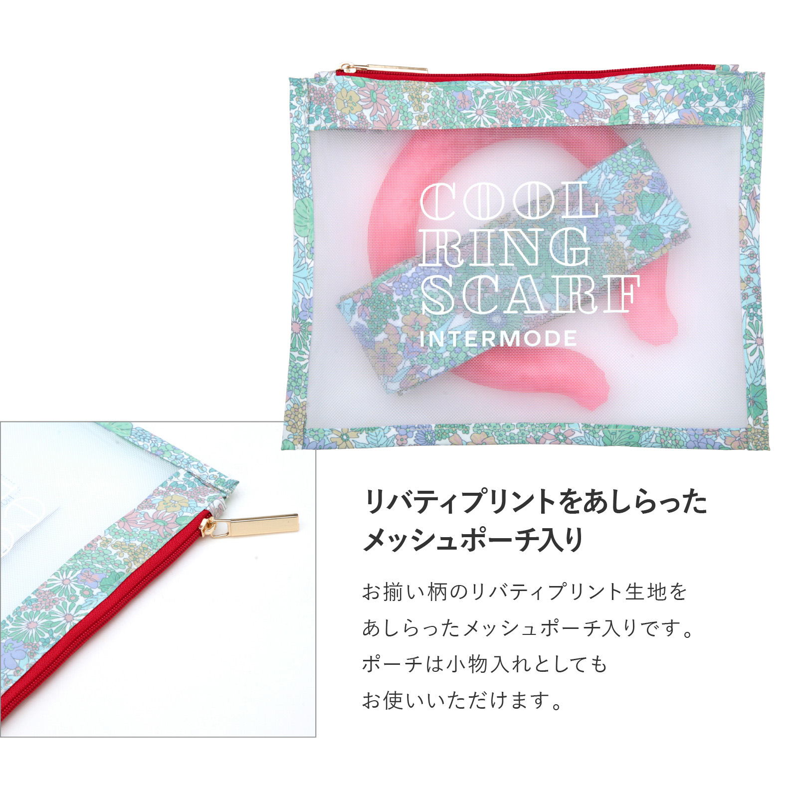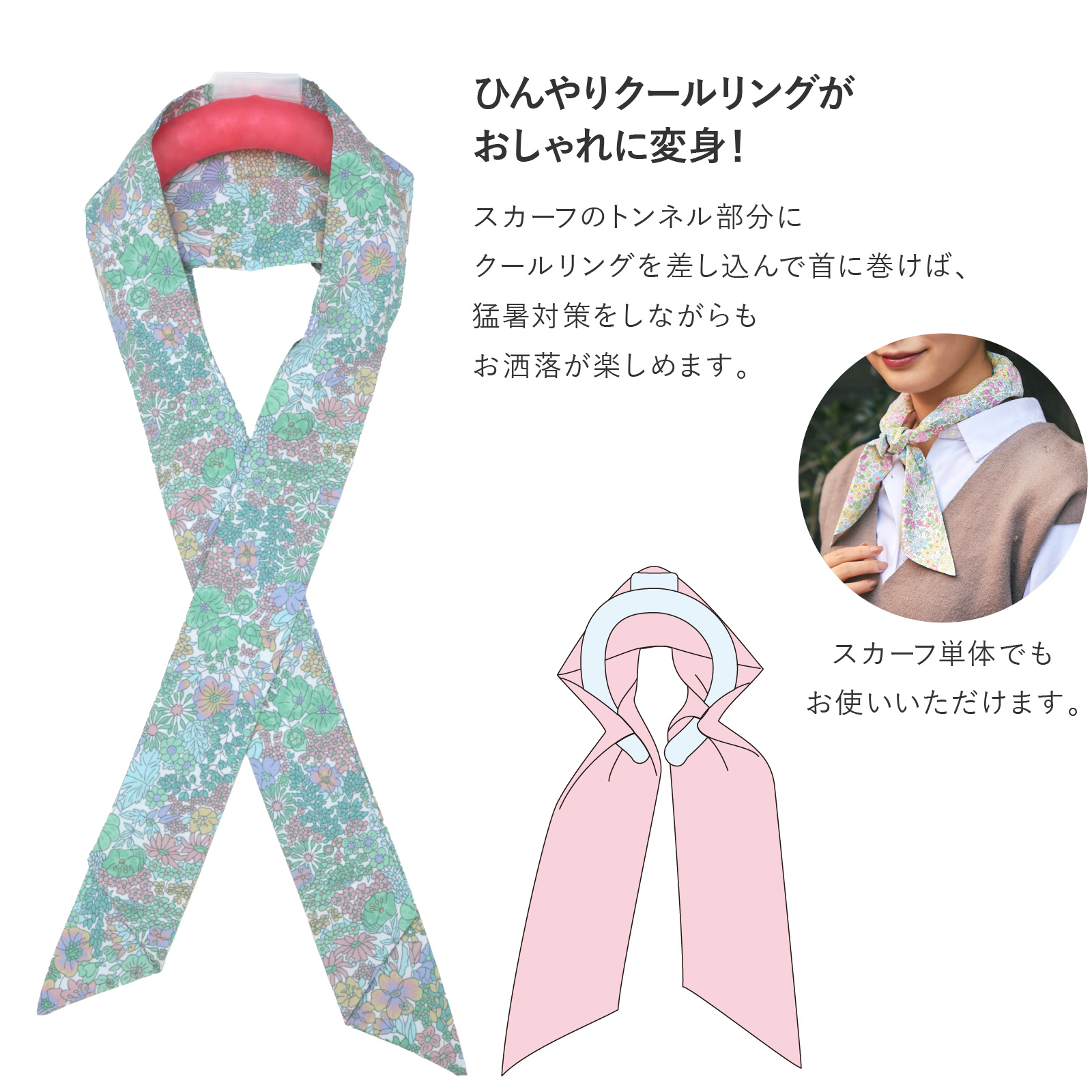 クールリングと、リングに装着可能なナロースカーフがポーチに入ったセット商品です。スカーフはリバティ生地を使用しております。