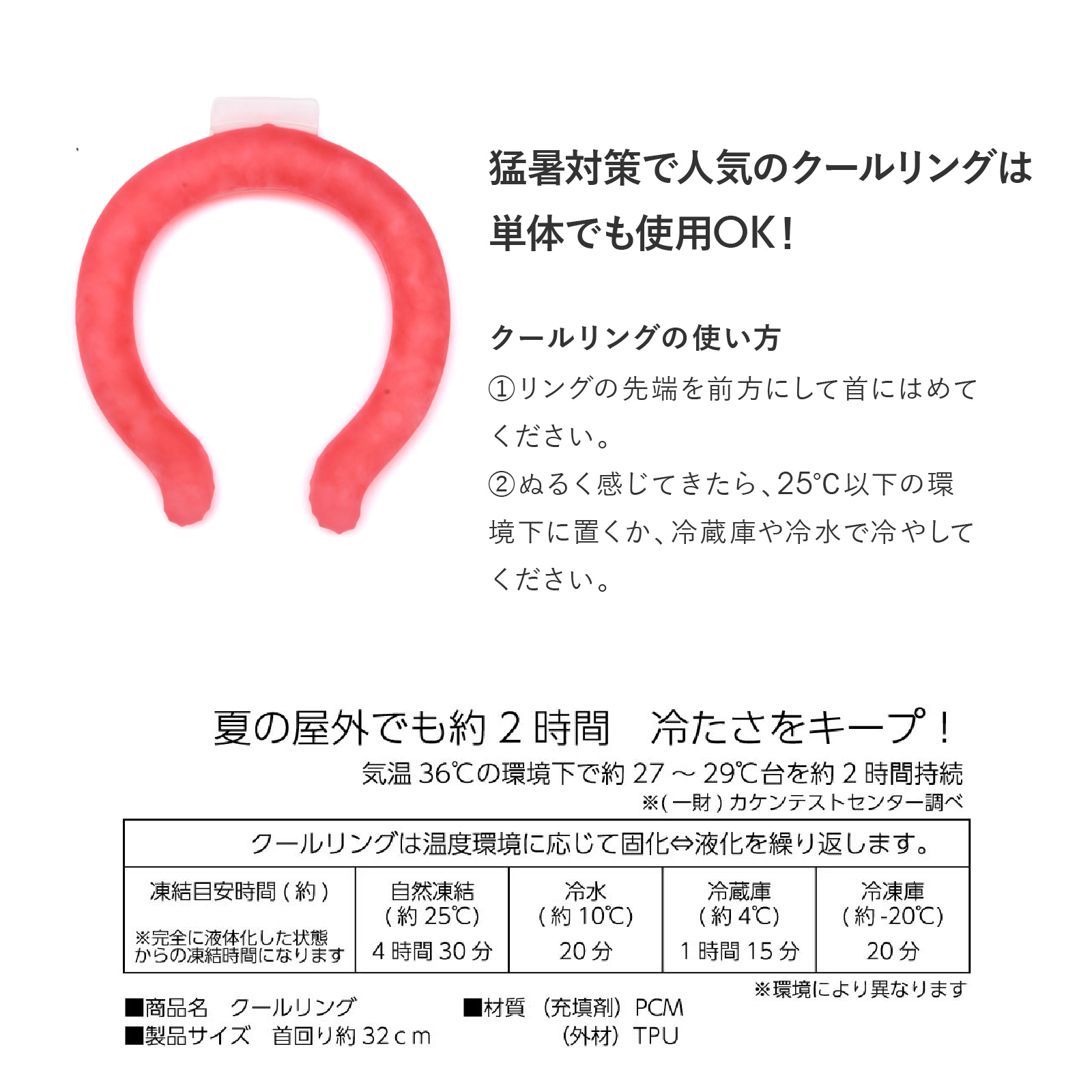 クールリングは夏の暑い時期でも約2時間冷たさが持続し、溶けた後冷やせば何度でもご使用いただけます。