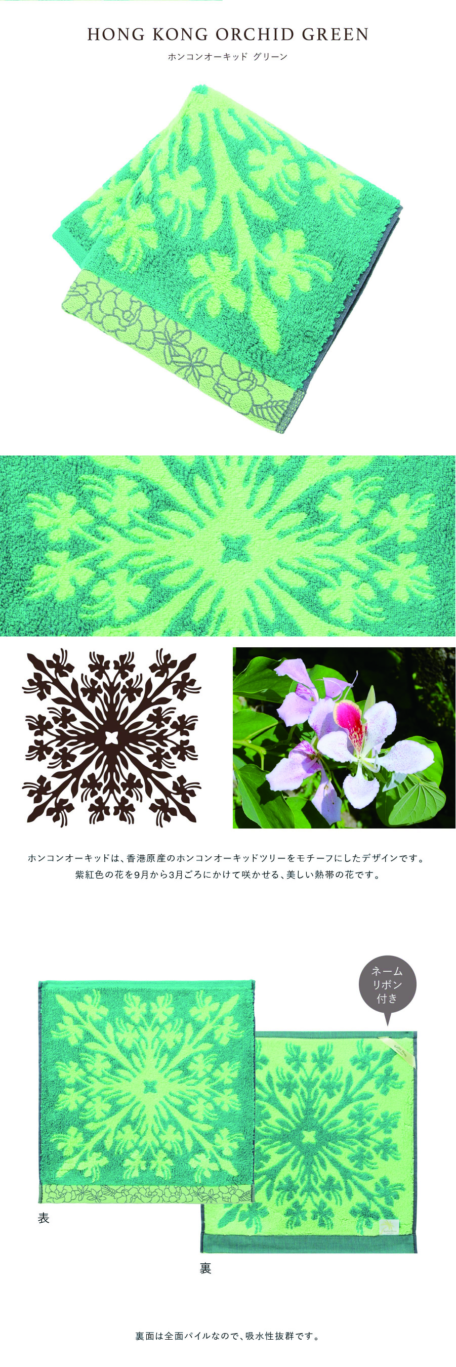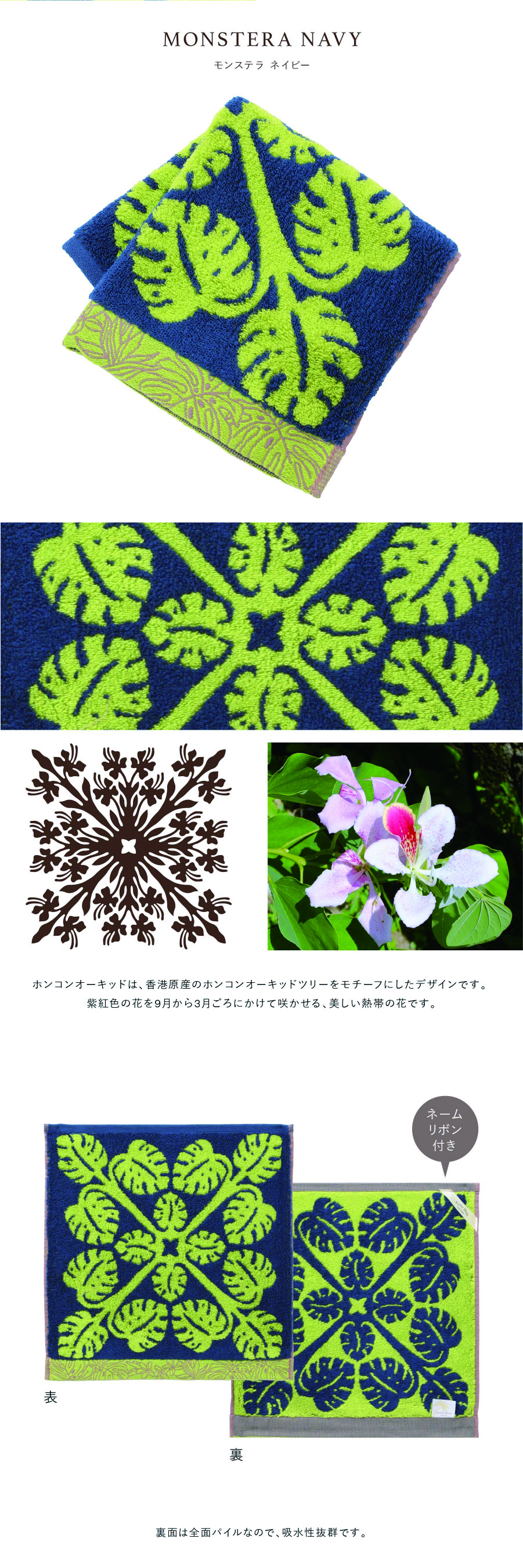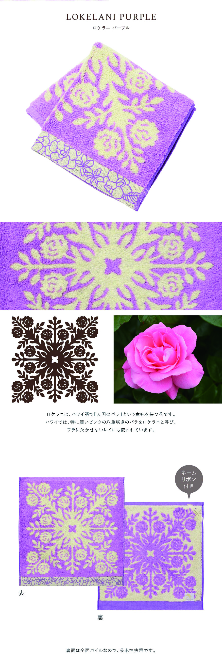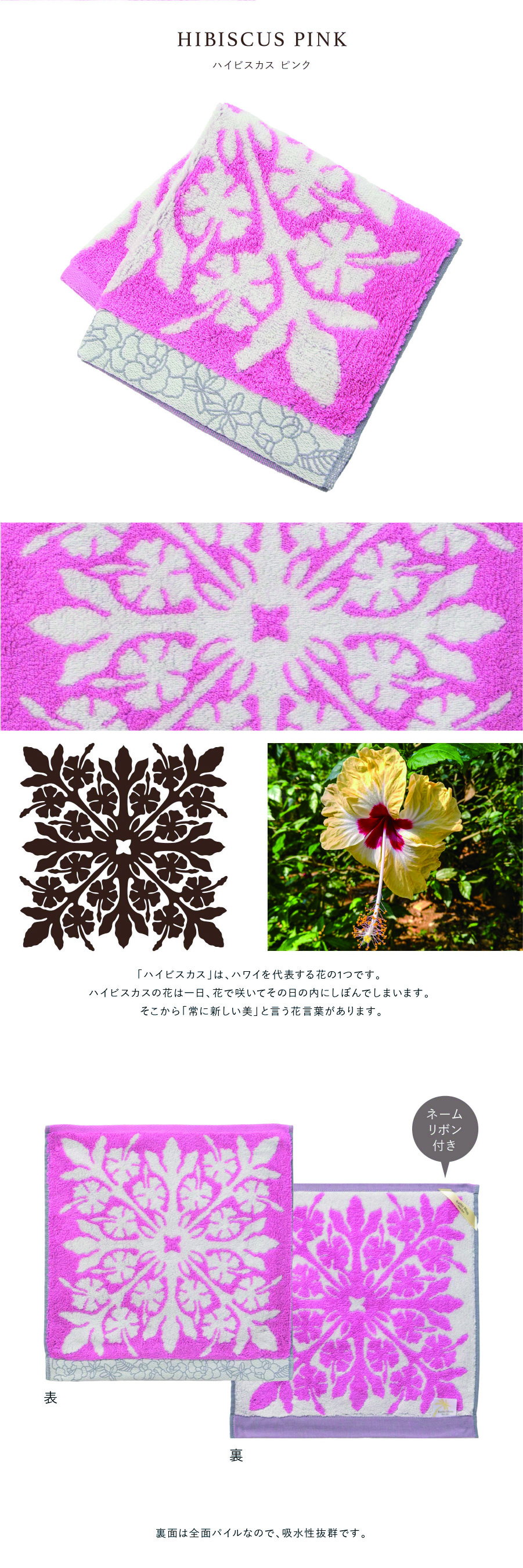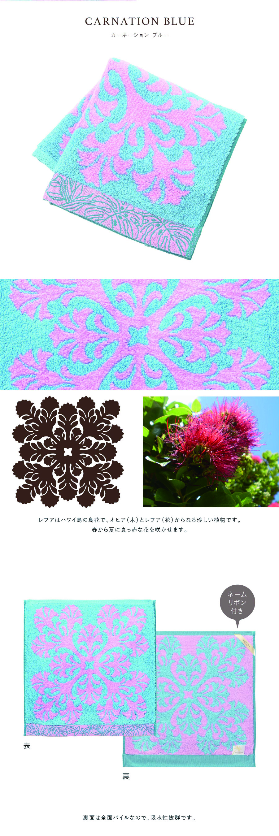 ハワイアンキルト作家、キャシー中島さんプロデュースの、ハワイの代表的な植物をモチーフにした、ふんわり柔らかなハワイアンキルト柄ハンドタオルです。