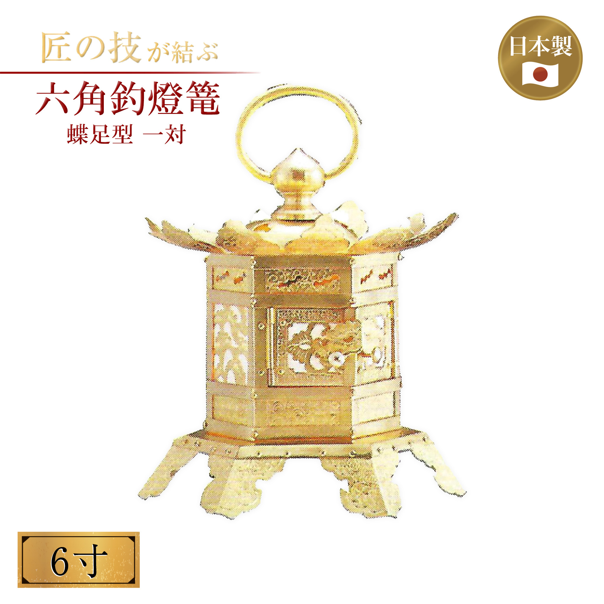 六角釣燈篭 蝶足型 一対 電装付 6寸 銅地箔押 灯篭 灯籠 燈籠 神具 神社 寺院 寺社仏閣 神棚