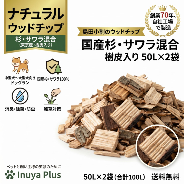 ●島田小割のウッドチップは、ヒノキやスギなど原木を加工して作られているため、ペットのおしっこなどがかかっても、ウッドチップがおしっこを吸収、さらに木から出る香りの成分が雑菌の繁殖を防ぐことで、臭いを防ぎます。また、ダニの発生、繁殖を防ぎます。