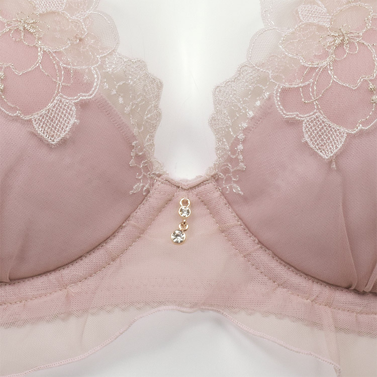 チュールをふんだんに使用し、カップ上辺やアンダー部分が透け感たっぷり。 チュールアップリケはE70〜位置を変えて大きいサイズでも寂しくならないよう調整。 フロントにはラメ糸のカラーに合わせた2連のクリスタルチャーム。 サイドボーンが脇流れを防止し、サイドすっきり&安定感UP。 ストラップは引き上げ力と安定感のある固定タイプ。 取り外し可能なパッドはポケットにフィットしてズレにくいタイプ。 バック布は軽い仕上がりのパワーネットで程よいホールド感。 |