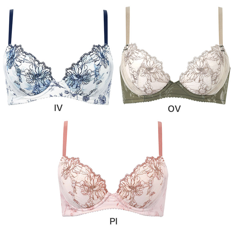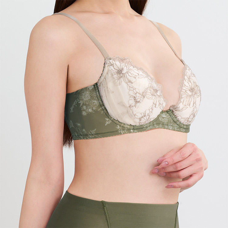 ラメ糸の光沢が美しいレースで、グレード感あるデザイン。 カップサイドにあしらった軽やかなチュールがポイント。 |