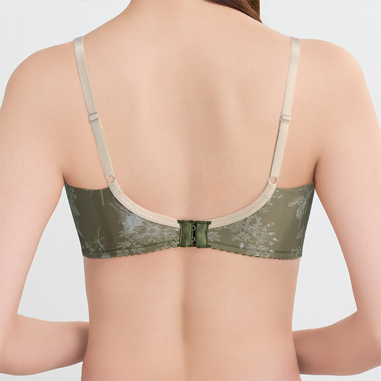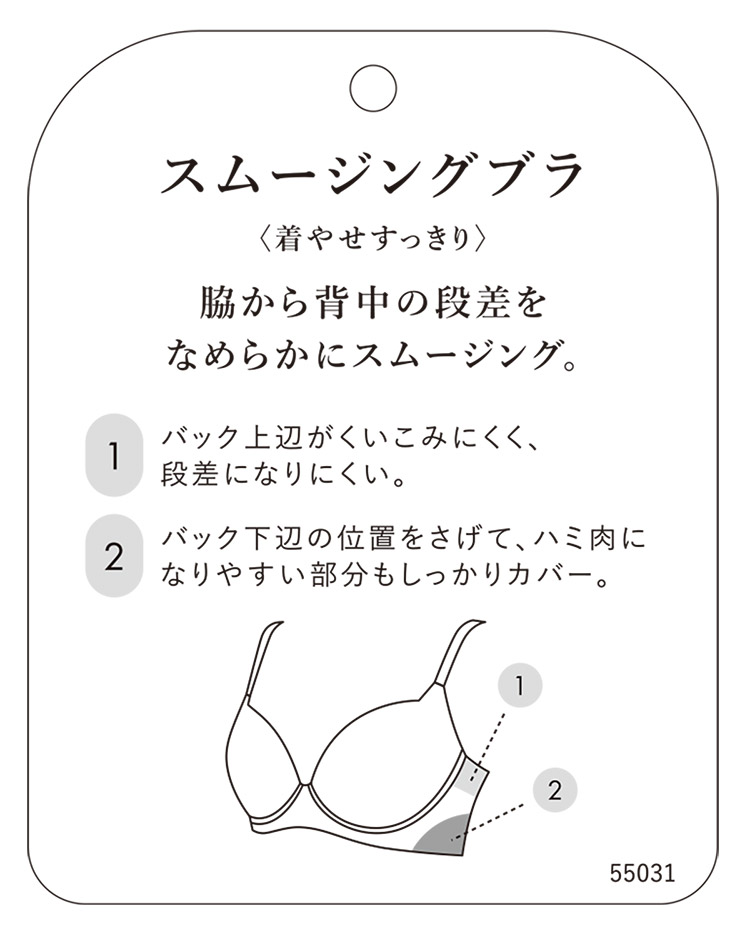 ●脇から背中のラインをすっきり、着やせシルエットに バック下辺の位置を下げることで、気になる脇から背中の段差をおさえなめらかに ●バック上辺はアウターにひびきにくい バック上辺は折り返し始末で肌にくいこみにくい ●カップ脇とアンダー部分はやさしい肌ざわり カップ脇上辺とアンダー部分は、伸びのよい肌側綿混ストレッチテープを使用