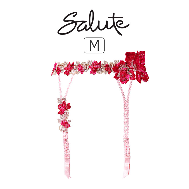 上品な花々がウエストを彩るロマンティックなガーターベルト。贅沢に飾られたレースをまとい、まるで絵画の世界に入りこんだような気分に。神秘的な美しさをもつアルバローズをイメージしたアップリケにはきらめくクリスタルをあしらいました。片方のストラップにほどこしたアップリケがワンポイント。コーディネイトに花を添えるゴージャスなアイテムです。 |