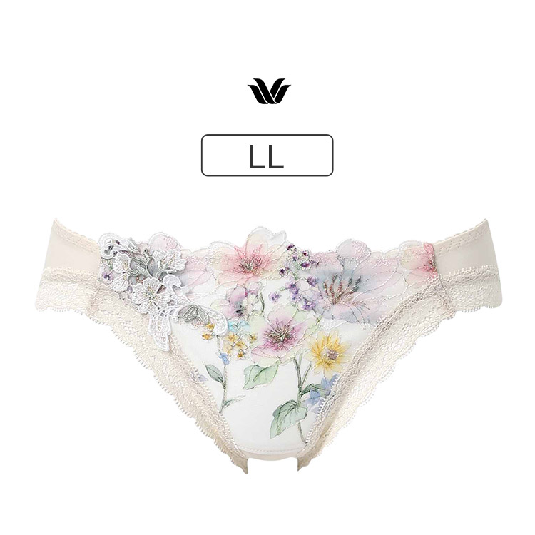 ・フロントは裏打ち付きで透けにくい ・春の訪れを感じるような華やかな彩りのプリント&ラメ糸のチュールエンブロイダリーレース ・サイドにはケミカルアップリケをあしらった華やかで豪華なデザイン ・はきこみ丈:あさめ・ハイレッグショーツ |