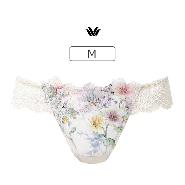 ・フロントは裏打ち付きで透けにくい ・春の訪れを感じるような華やかな彩りのプリント&ラメ糸のチュールエンブロイダリーレース ・サイドにはケミカルアップリケをあしらった華やかで豪華なデザイン ・はきこみ丈:あさめ・Tバックショーツ |