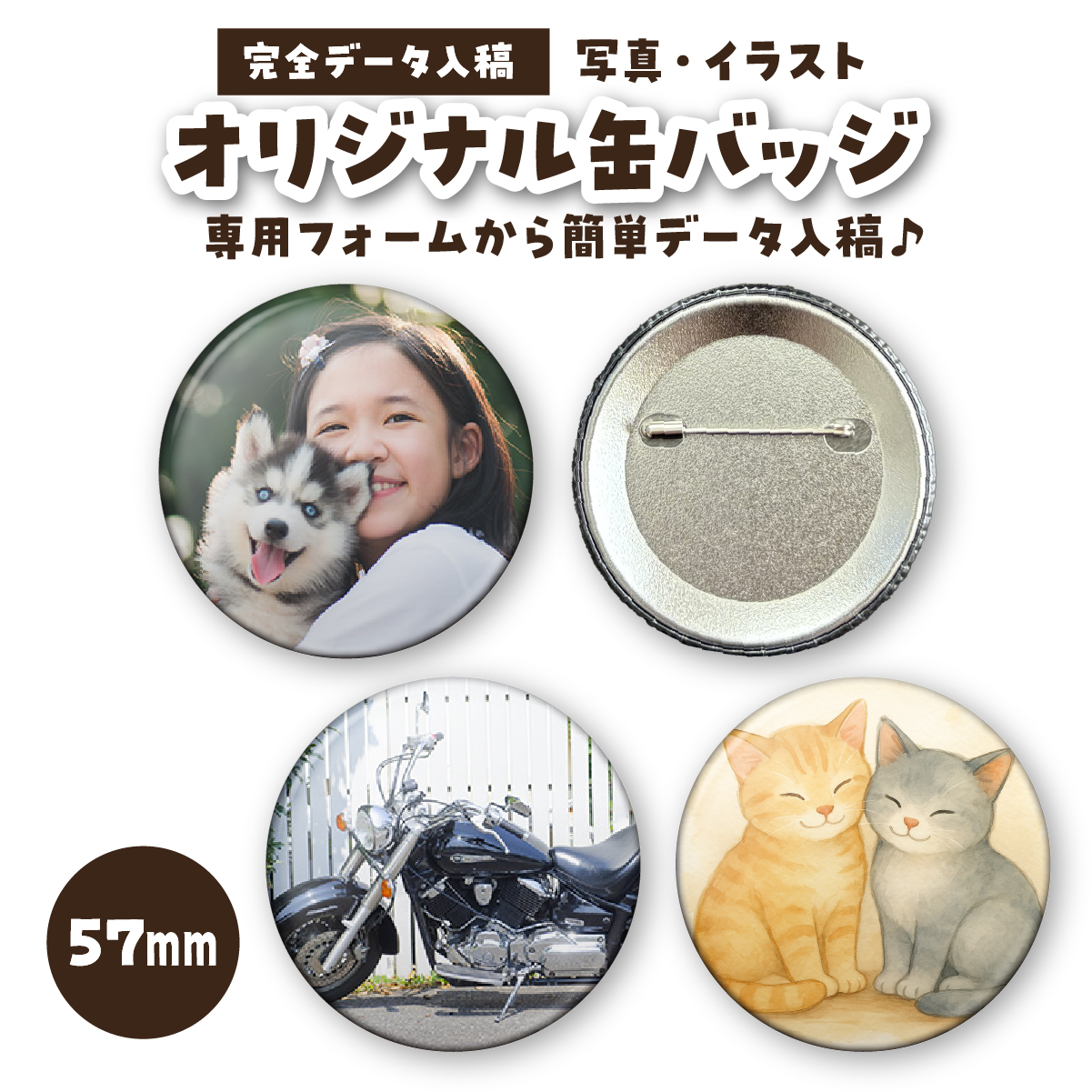 オリジナル缶バッジ(バッチ)、57mm、1個