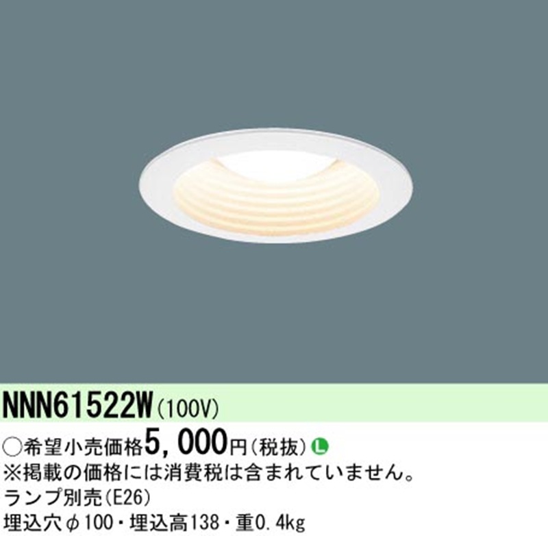 パナソニック (Panasonic) ダウンライト NNN61522W 天井埋込型 φ100 LED電球別売(E26)