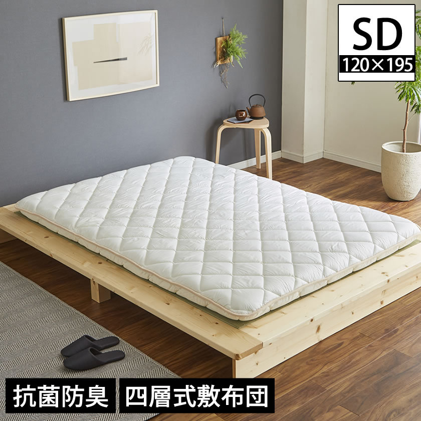 | 四層敷き布団 抗菌防臭 12cm厚 セミダブル 長さ(約)195cmのベッドで使える敷き布団。ベッドには長すぎたり短すぎたりすることが多い「敷き布団」をベッドに使いやすい長さにつくりました。 側生地 綿100% 固綿2枚重ね ボリューム感と床付き感の軽減、カラダの沈み込み過ぎを抑え 快適快眠サポート 巻綿には清潔に安心してお使い頂けるように、抗菌防臭加工 SEKマーク(青)取得した シキボウ「ノンスタック加工」中わたを使用しています。固綿をふんわりやわらかい中綿でくるみ、ボリュームのあるお布団に仕上げました。国内の工場で生産された日本製 敷き布団 4層式敷ふとん ベッドはもちろん、フローリングや畳に敷いてお使いいただけます。 ■サイズ(約): 幅120×長さ195×厚12cm ■材質: 側生地:綿100%(205本ブロード40番手 縦133本横72本 高密度で織り上げた生地です。) 巻綿:ポリエステル100% (シキボウ 抗菌防臭防ダニ加工ノンスタック使用)(重量:約2.3kg) 固綿(中芯):ポリエステル100%(ポリエステル圧縮固綿(約4cm厚)×2枚)(重量:約3.4kg) ■組立:完成品 ■生産国:日本製 ■梱包:1個口:75×45×50cm ■備考: 【BE】 ※商品画像は色合いや素材感が実際の商品と異なる場合がございます。 モニター・ディスプレイによっても写り方が変ります。予めご了承ください。 |