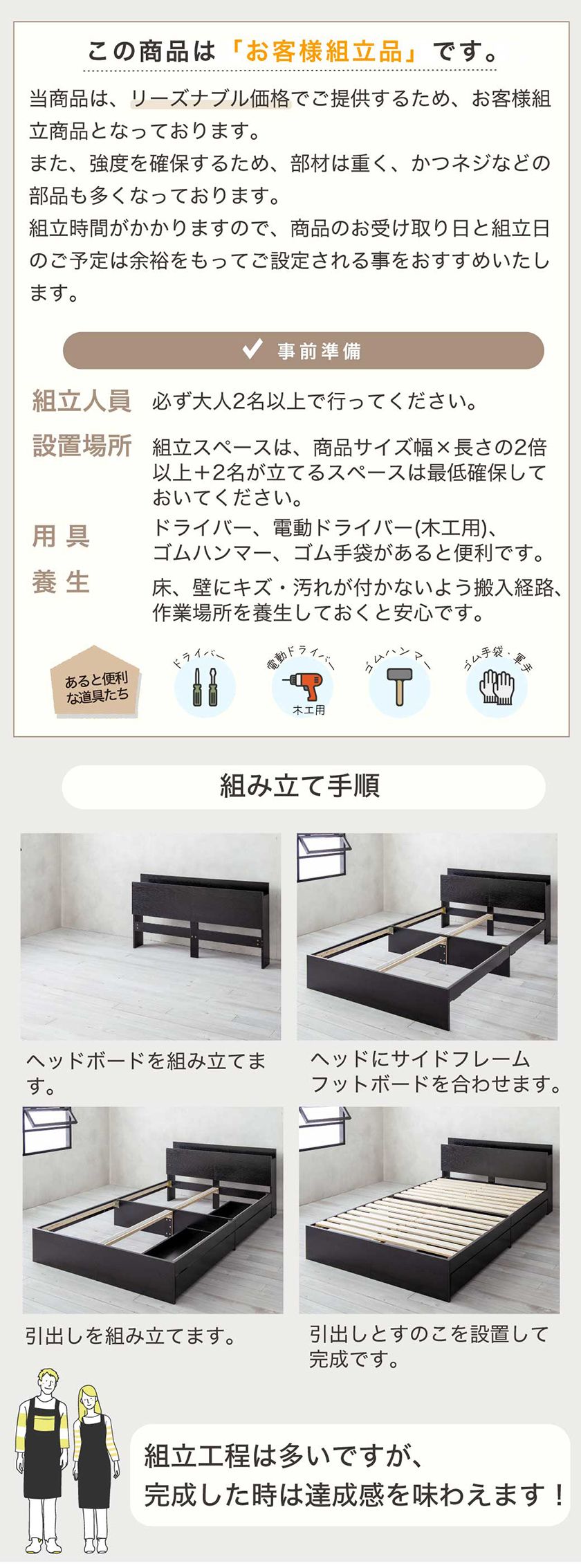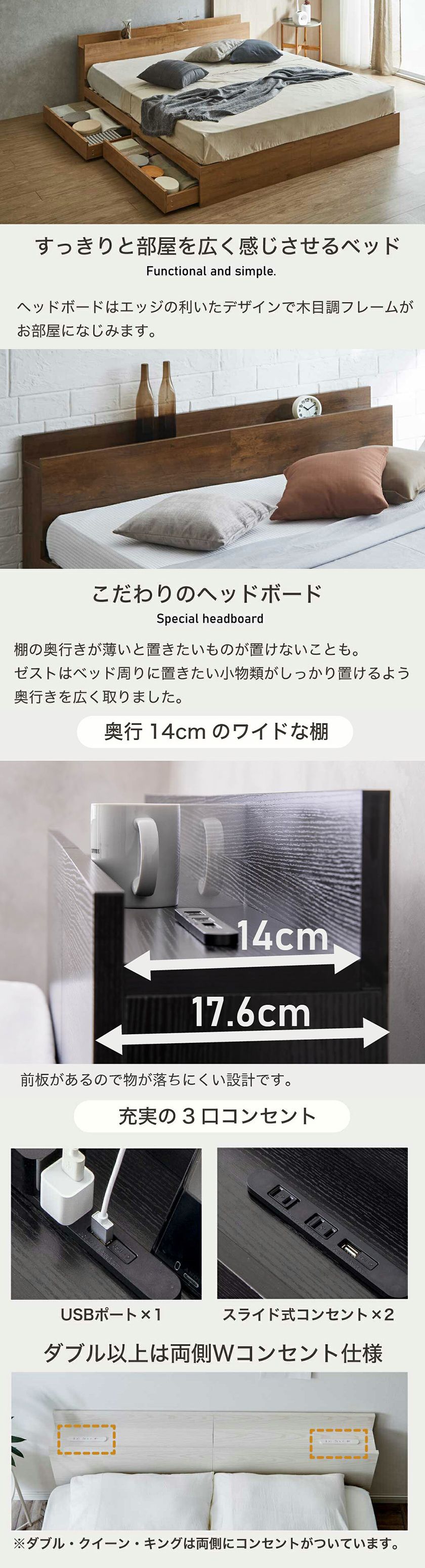 | 「機能性とデザイン性を兼ね備えた大容量収納付きベッド」 おしゃれで実用的な収納付きベッドが登場。セミシングル・シングル・セミダブルの豊富なサイズ展開。 ヘッドボードにはUSBポート1口、コンセント2口の計3口を搭載し、スマートフォンの充電も可能です。 耐水性・耐熱性・耐摩耗性に優れた「メラミン化粧板」を採用し、美しさと耐久性を両立。さらに、キャスター付きの2杯引き出し収納を備え、衣類や小物をすっきり整理でき、ベッド下を有効活用できます。 シンプルで北欧風のデザイン、充実した収納力、便利な機能が詰まったベッドです。 ■保証期間:ベッドフレーム:1年、Zマットレス:3年 ■サイズ(約):幅180.2×奥行213.4×高さ71.8cm マットレス:幅180×奥行195×高さ15cm、ベッド床面有効長さ:197.6cm、床面高26.5cm、引き出し内寸:幅91.9×奥行39.4×高さ7.7cm ■材 質:フレーム:メラミン樹脂シート張り化粧板、LVLすのこ床板 マットレス:生地:ポリエステル100%中材:ポケットコイル、ウレタンフォーム、フェルトコイル線径:2.0mm ■耐荷重(約):ベッドフレーム:150kg ■組 立:フレーム:組立品(大人2人約120分) 使用工具:プラスドライバーをご用意ください。 マットレス:圧縮梱包を開封・復元する作業があります。 ■生産国:中国 ■梱 包:フレーム1)幅103.5×長さ33×高さ19.5cm 梱包重量25kg、2)96×35×16cm 梱包重量23kg、※他マットレス ■備考: ![]() ゼスト専用開梱組立設置サービス ※納期表示の異なる商品を同時に購入した場合、納期の遅い商品とまとめて発送する場合がございます。予めご了承ください。 |