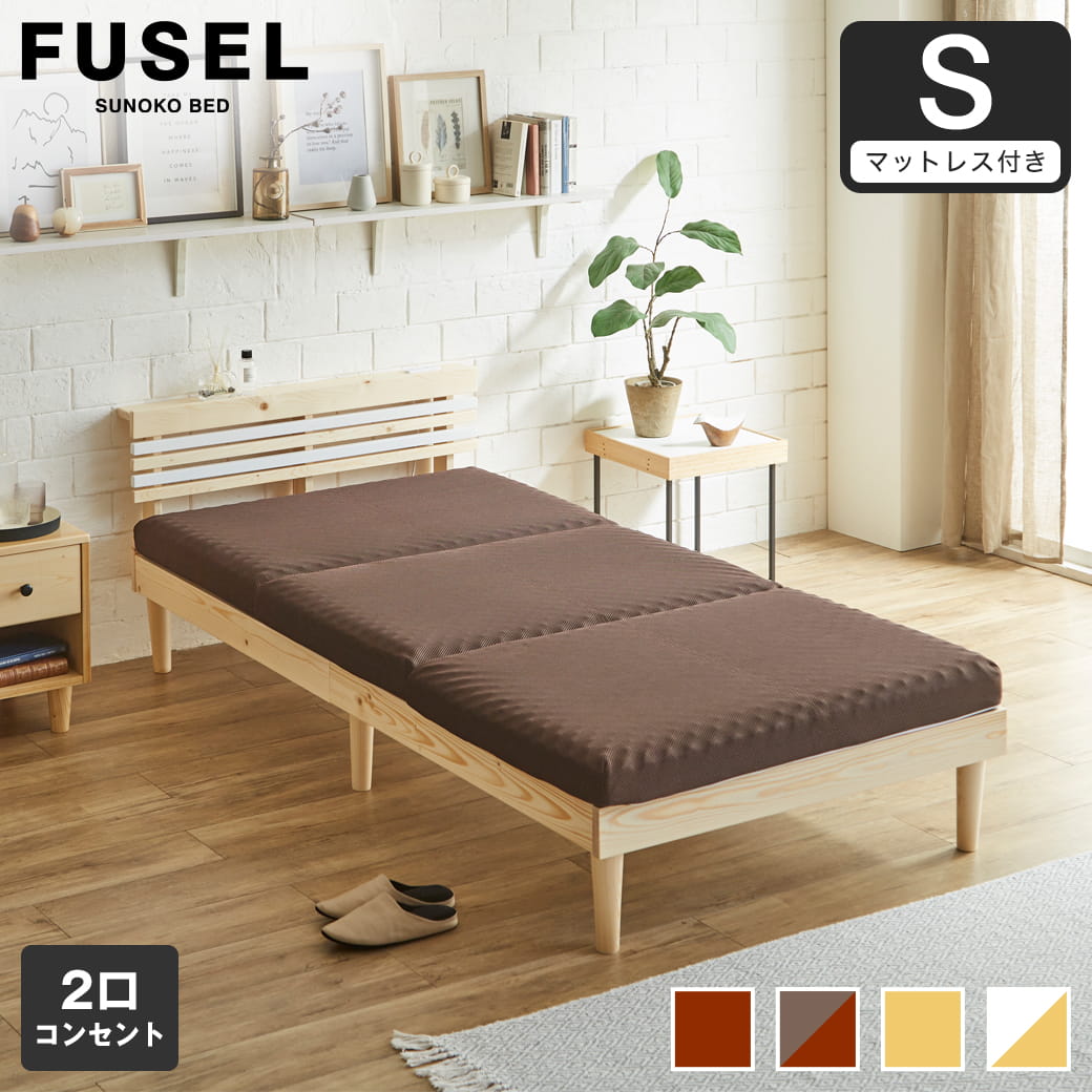 ベッド フュゼル すのこベッド 棚付きベッド シングル 厚さ10cm三つ折り30Dウレタンマットレス付き 木製