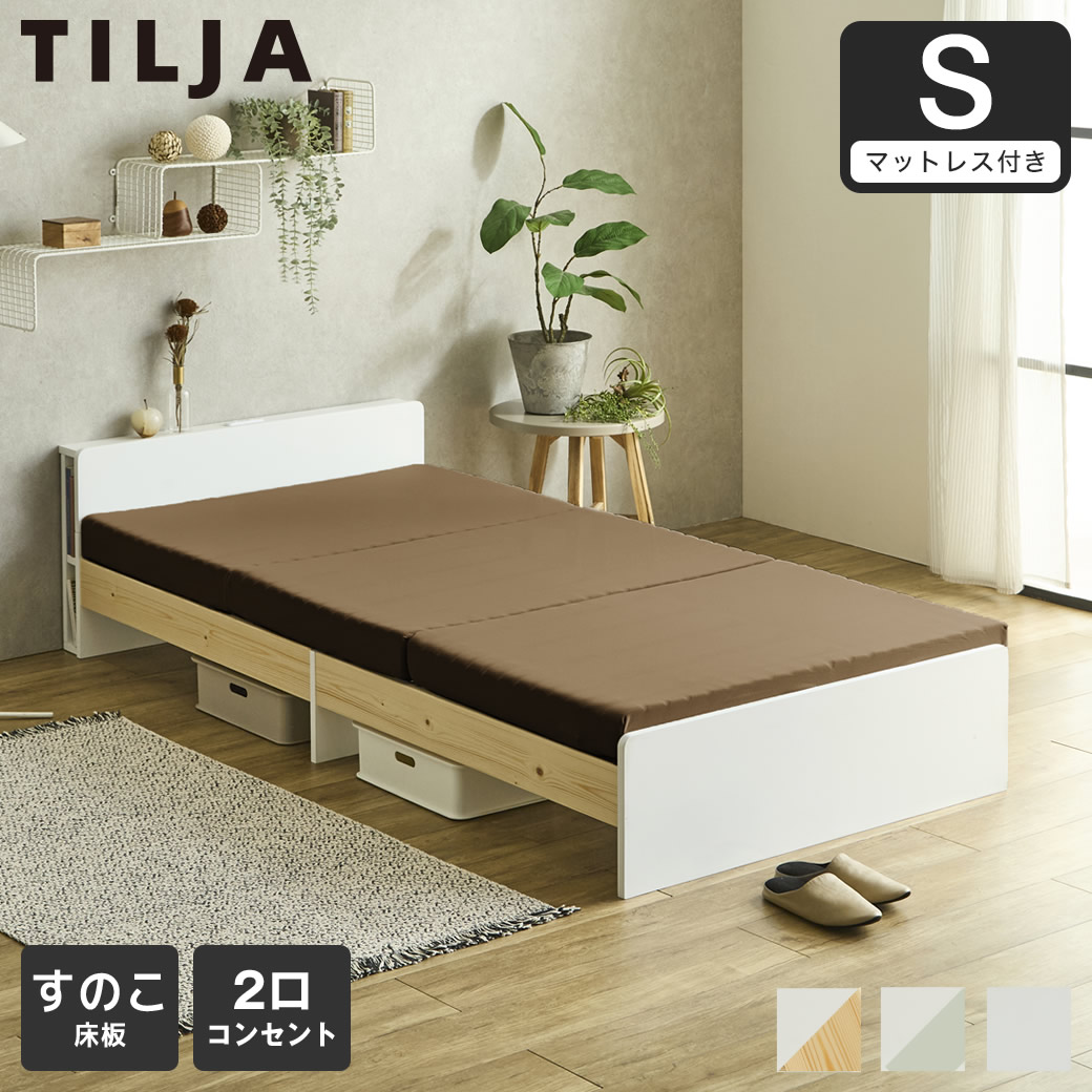ベッド ティリア すのこベッド 棚付きベッド シングル 25D三つ折りブロックウレタンマット付 木製 コンセント ツートンカラー