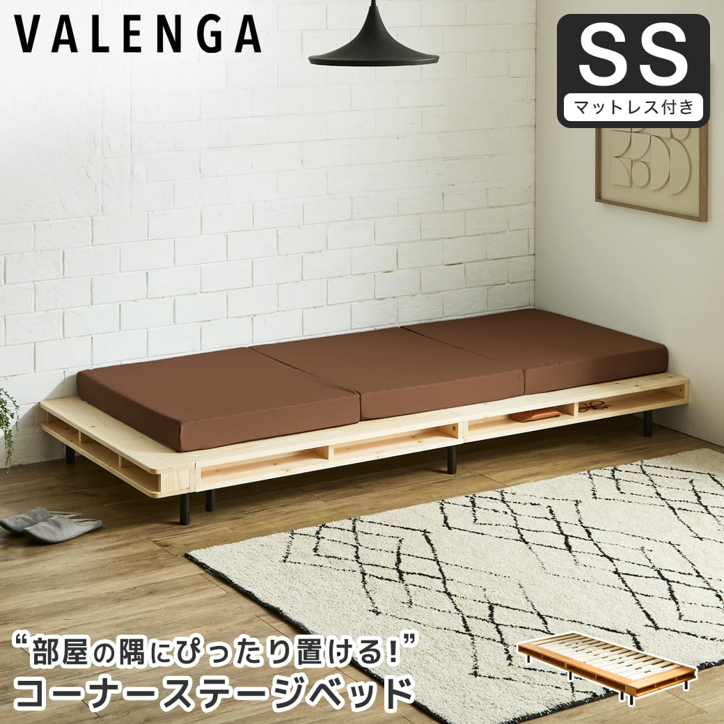 | 片側サイドとフットにシェルフが付いた当社オリジナルのコーナーステージベッド「ヴァレンガ」。 北欧天然木とマットなアイアン脚を組み合わせた他には無いスタイリッシュなデザインが目を惹く、おしゃれで開放感のあるローベッドです。 シェルフは読みかけの本やスマートフォン、小物を置く収納・ディスプレイスペースとして大活躍します。 2台並べると両側サイドにシェルフが付いたワイドベッドとしても使え、夫婦やカップルでのご使用もおすすめです。 デザイン性と機能性を兼ね備えた洗練されたフォルムで、毎日の寝室をワンランク上のリラックス空間へと導きます。 ■保証期間:1年 ■サイズ(約):・ベッド外寸:幅92.5×長さ209×高さ22cm ・ベッド床面有効内寸:幅80×長さ195cm ・マットレス外寸:幅80×長さ195×厚さ10cm ■材 質:・ベッド:天然木パイン材(ラッカー塗装)、LVL、スチール ・マットレス:ポリエステル100%(メッシュ生地)、ウレタン ■耐荷重(約):150kg ■組 立:お客様組立品(大人2人約30分) ■生産国:中国 ■梱 包:・ベッド:1個口:(1-1)103×36×26cm(25.6kg) ・マットレス:1個口:(1-1)37×37×43cm(5.3kg) ■備考:【BR】【NA】 |