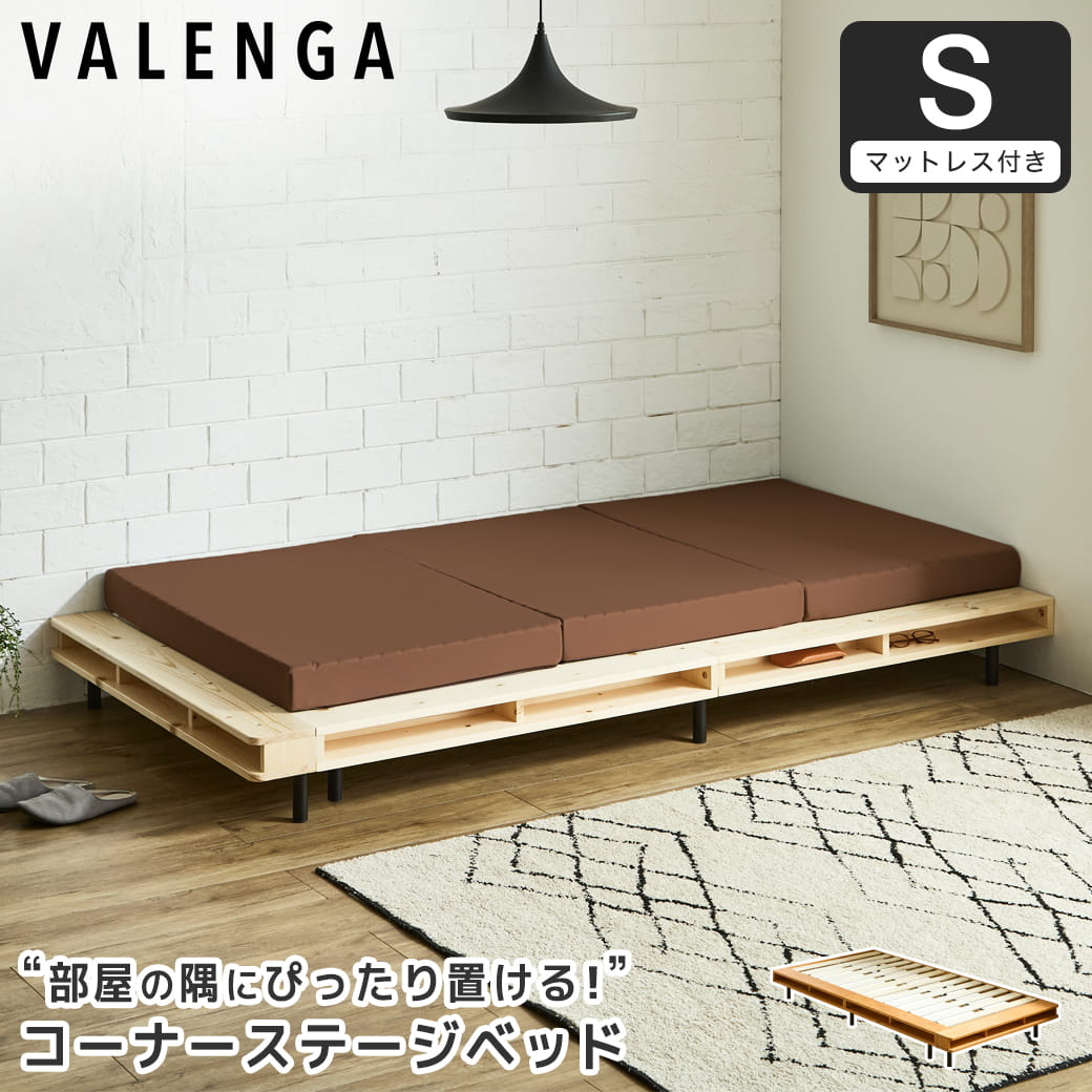 | 片側サイドとフットにシェルフが付いた当社オリジナルのコーナーステージベッド「ヴァレンガ」。 北欧天然木とマットなアイアン脚を組み合わせた他には無いスタイリッシュなデザインが目を惹く、おしゃれで開放感のあるローベッドです。 シェルフは読みかけの本やスマートフォン、小物を置く収納・ディスプレイスペースとして大活躍します。 2台並べると両側サイドにシェルフが付いたワイドベッドとしても使え、夫婦やカップルでのご使用もおすすめです。 デザイン性と機能性を兼ね備えた洗練されたフォルムで、毎日の寝室をワンランク上のリラックス空間へと導きます。 ■保証期間:1年 ■サイズ(約):・ベッド外寸:幅109.5×長さ209×高さ22cm ・ベッド床面有効内寸:幅97×長さ195cm ・マットレス外寸:幅97×長さ195×厚さ10cm ■材 質:・ベッド:天然木パイン材(ラッカー塗装)、LVL、スチール ・マットレス:ポリエステル100%(メッシュ生地)、ウレタン ■耐荷重(約):150kg ■組 立:お客様組立品(大人2人約30分) ■生産国:中国 ■梱 包:・ベッド:1個口:(1-1)115×36×26cm(27.2kg) ・マットレス:1個口:(1-1)37×37×53cm(6.4kg) ■備考:【BR】【NA】 |