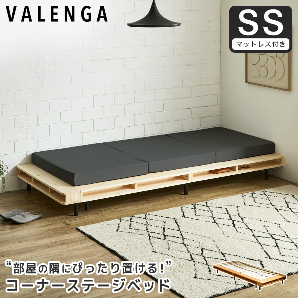 | 片側サイドとフットにシェルフが付いた当社オリジナルのコーナーステージベッド「ヴァレンガ」。 北欧天然木とマットなアイアン脚を組み合わせた他には無いスタイリッシュなデザインが目を惹く、おしゃれで開放感のあるローベッドです。 シェルフは読みかけの本やスマートフォン、小物を置く収納・ディスプレイスペースとして大活躍します。 2台並べると両側サイドにシェルフが付いたワイドベッドとしても使え、夫婦やカップルでのご使用もおすすめです。 デザイン性と機能性を兼ね備えた洗練されたフォルムで、毎日の寝室をワンランク上のリラックス空間へと導きます。 ■保証期間:1年 ■サイズ(約):・ベッド外寸:幅92.5×長さ209×高さ22cm ・ベッド床面有効内寸:幅80×長さ195cm ・マットレス外寸:幅80×長さ195×厚さ10cm ■材 質:・ベッド:天然木パイン材(ラッカー塗装)、LVL、スチール ・マットレス:ポリエステル100%(メッシュ生地)、ウレタン ■耐荷重(約):150kg ■組 立:お客様組立品(大人2人約30分) ■生産国:中国 ■梱 包:・ベッド:1個口:(1-1)103×36×26cm(25.6kg) ・マットレス:1個口:(1-1)37×37×44cm(6kg) ■備考:【BR】【NA】 |