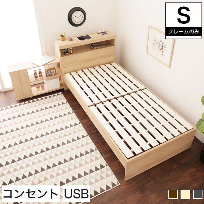 シンプルなすのこベッドにオープンシェルフ付き宮棚ヘッドを組み合わせ、モダンなデザインで仕上げた、当社オリジナルの木製すのこベッド"Wanda"シングルサイズ。