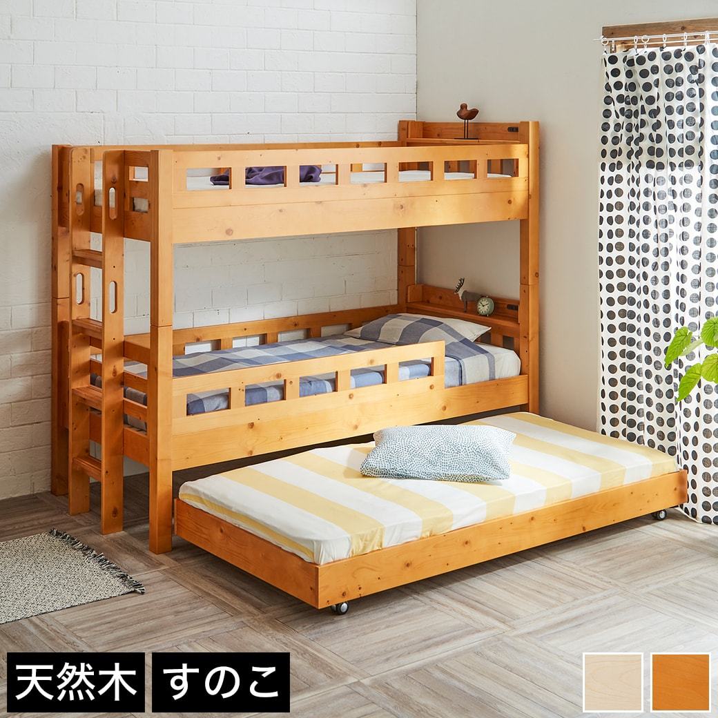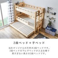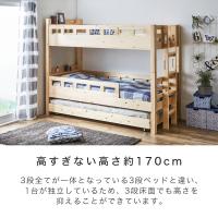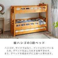 | 当社オリジナルの木製3段ベッドです。 2段ベッド+独立した子ベッドという構成のため、3段すべてが1台になっている3段ベッドに比べ高すぎない高さ設計です。 ハシゴがサイドではなく、フット側に付くため、子ベッドを出している時にハシゴが子ベッドに干渉することがありません。 2段ベッドの上下段ともに小物が置くのにちょうどいい棚付き。棚には2口スライドコンセントが付いているため、スマホ等の充電も出来て便利です。 床面は3段全て通気性の良いすのこ仕様のため、オールシーズン快適に眠れます。 ■サイズ(約): ・2段ベッド外寸:幅103.6×長さ215×高さ171cm ・子ベッド外寸:幅99×長さ196×高さ21cm ・床面高:(上段)131/(下段)40/(子ベッド)16cm ■材質: 天然木パイン材(ラッカー塗装)、LVL材 ■耐荷重(約):100kg(各段) ■組立:組立品(大人2人約60分) ■生産国:中国製 ■梱包:・梱包数:7個口 ・梱包サイズ:110.2×86.3×15.3cm(15.2kg)/111×94×15.2cm(16.4kg)/203×49×13.2cm(26.6kg)/105.8×99×12.2cm(26kg)/164×38×10.6cm(5.8kg)/199.5×31×8.9cm(12.2kg)/96.1×100×7cm(13kg) ■備考: 【NA】【LBR】 ※上下段を分割して使用することもできますが、上下段で支柱の長さが異なるため、高さの異なる見た目となります。 |