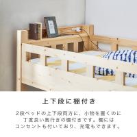 2段ベッドの上下段には小物を置くのにちょうどいい奥行きの棚付きです。棚にはホコリが入りにくいスライドコンセントがそれぞれ2口付いており、スマホ等の充電に便利です。