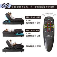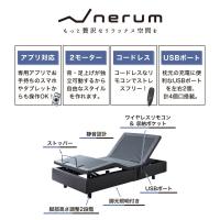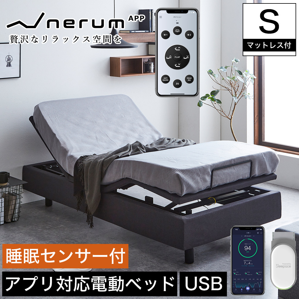 | 静音設計・2モーター内蔵!アプリ対応の電動リクライニングベッドnerumappのマットレスセットです。 【アプリ対応】【スマホ・タブレットから操作可能】【睡眠センサー付】【2モーター】【静音設計】【USBポート付】【足元照明付】【脚部高さ2段階調整可能】 ・数量限定!独自のアルゴリズムによる睡眠のスコア化はもちろん、睡眠時間の詳細や睡眠の深さ等の各種計測データを確認することが出来る睡眠センサー付き。 ・専用リモコン、またはお手持ちの対応可能なOSが入ったスマホやタブレットでも頭、脚の上下リクライニング操作が可能です。 ・無重力ポジションやいびき防止や読書ポジションの他、自分の好きなポジションを記憶させることが可能なじぶんポジション機能があります。 ・脚部は2段階高さ調整ができ、安心のロースタイルからソファーのような高さまでマットレスの厚みやライフスタイルに合わせて調整可能です。 ・床板は通気性と耐久性に優れた、スチール・メッシュ仕様です。 ・リクライニング中に障害物が挟まった場合、モーターの力が加わらない、安全性の高い構造になっています。 ※専用リモコン用に別途単4電池が2本必要となります。電池は付属しておりませんのでご用意ください。 ※睡眠センサーは数量限定のため、在庫なくなり次第予告なく終了いたします。 ※こちらの商品は「neruco バリューポケットコイルマットレス」がセットとなっております。 ■サイズ(約):ベッドフレーム:幅97×長さ195×高さ29cm/33cm 睡眠センサー:長さ:約83cm(ベルト長さ含む)/幅:4.5cm/厚さ:1.5cm/重量:約100g (リチウムイオン電池充電式(USBケーブル付)※満充電で約1ヶ月程度連続使用可能) マットレス:幅97×長さ195×厚さ20cm ■材質:ベッドフレーム:スチール(粉体塗装)、合板、ポリエステル、ウレタンフォーム マットレス:表面生地:ポリエステル100% 、ニット織/側面生地:3Dメッシュ/中材:ポケットコイル、ウレタン、白色ピュアフェルト/コイル数:512個、コイル線径:2.0mmコイル巻き数:5.5巻き、コイル鋼線種:SWRH72B ■耐荷重(約):180kg ■組立:お客様組立品(2名15分) ※組立に必要な工具は付属しています。 ■生産国:ベッド:中国製(商品およびモーター規格設計ドイツ)、マットレス:中国製 ■梱包:1/2:103×103×28cm(37.5kg)、2/2:103×103×28cm(31.5kg) マットレスは圧縮梱包でお届けします。※3個口 ■備考: 【フレーム1年保証】【マットレス5年保証】 ※リモコンに電池は付属しておりません。別途、単4電池2本をご用意ください。 ※お持ちのスマートフォンやタブレット等、アプリ対応端末でベッドの操作が可能です。アプリはApp Store/Google Playから無料でダウンロードできます。(対応OS:iOS 9.0 以降 / Android 5.0 以降) ※使用可能なマットレスは、枠線の無いマットレスです。枠線のあるマットレスの場合、マットレスのリクライニングができません。マットレスを別にご利用の際はご注意願います。 ※敷き布団をご使用の場合、固わた入りの厚みのあるものをご使用ください。 ※睡眠センサー(Sleepace)について:ベッド操作用のアプリとは別に、専用アプリのダウンロードが必要です。 ※Nerum App / Sleepace AppはApp Store/Google Playから無料でダウンロードできます。 ※スマートフォン及びタブレット端末本体は付属していません。 | ||||