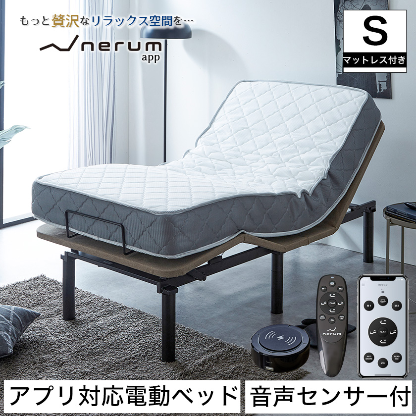 | 静音設計・2モーター内蔵!アプリ対応のアジャスタブル電動リクライニングベッドnerumapp。 【音声センサー付き】【アプリ対応】【スマホ・タブレットから操作可能】【睡眠センサー付】【2モーター】【静音設計】【USBポート付】【足元照明付】【脚部高さ5段階調整可能】 ・音声センサーで「ベッド」と音声で指示が可能です。音声コントロールのパターンは「頭をあげて」「頭をさげて」「脚をあげて」「脚をさげて」「止めて」「フラットにして」「テレビポジション」「じぶんポジション」「無重力ポジション」「いびき防止ポジション」「ライトを点けて」「ライトを消して」の12パターン対応。 ・音声センサーにはワイヤレス充電とUSBポート(Type-A+Type-C)付き。 ・専用リモコン、またはお手持ちの対応可能なOSが入ったスマホやタブレットでも頭、脚の上下リクライニング操作が可能です。 ・無重力ポジションやいびき防止や読書ポジションの他、自分の好きなポジションを記憶させることが可能なじぶんポジション機能があります。 ・脚部は2段階高さ調整ができ、安心のロースタイルからソファーのような高さまでマットレスの厚みやライフスタイルに合わせて調整可能です。 ・床板は通気性と耐久性に優れた、スチール・メッシュ仕様です。 ・リクライニング中に障害物が挟まった場合、モーターの力が加わらない、安全性の高い構造になっています。 ・脚を調整する事で3段階に高さ調整ができ、折り畳み収納も可能です。(バネ式ではありません) ※専用リモコン用に別途単4電池が2本必要となります。電池は付属しておりませんのでご用意ください。 ※マットレスは厚さ20cmのポケットコイルマットレス付きです。 ■サイズ(約):【本体外寸】幅97×長さ195×床面高さ20・22.7・29・31.7・40.7cm ベッド下高さ(5段階) 10・12.7・19・21.7・30.7cm 調節可能角度(約):【頭部】65°±2°【脚部】35°±2° 脚部:直径6cm 音声センサー(約):直径9×高さ4.1cm コードの長さ:2.5m マットレス:本体:(約)幅97×長さ195×厚さ20cm ■材質:本体:スチール(粉体塗装) 床面部:ポリエステル100% マットレス:表面生地:ポリエステル100% 、ニット織 側面生地:3Dメッシュ 中材:ポケットコイル、ウレタン、白色ピュアフェルト コイル数:512個、コイル線径:2.0mmコイル巻き数:5.5巻き、コイル鋼線種:SWRH72B ※衛生・コンパクト、圧縮梱包でお届けいたします。 ■耐荷重(約):180kg ■組立:組立品(2人で15分) ■生産国:ベッド:中国製(商品およびモーター規格設計ドイツ) マットレス:企画:日本 製造:中国 ■重量(約):マットレス:19.8kg ■梱包:・電動ベッド梱包サイズ(約):1個口:102×100×13cm(43.5kg) ・音声センサー梱包サイズ(約):1個口:16×15×5cm(500g) ・マットレス:1個口 ■備考: 1年保証付き コードの長さ(約):4m(電源BOX含む) 音声センサーコードの長さ(約):2.4m ※本体折り畳みについて ・他社製品のバネ式による折りたたみ式ではありません。 ・ベッドを組み立てる場合、ボルトとワッシャーの取り付けが必要です。 ・ベッドを折りたたむ場合、ボルトとワッシャーの取り外しが必要です。 | ||||