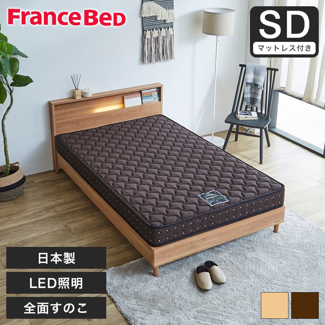| フランスベッド製の木目が美しい国産ベッドフレーム。 ●マットレスセット●スノコベッド●棚付き●LED照明付き●一口コンセント付き●日本製● シンプルで上品な棚付きすのこベッドはレッグタイプですっきりとした印象。どんなお部屋にも似合う北欧風の温かみある色合いです。 湿気を逃がす通気性の高いスノコ床面なのでじめじめした季節も安心してお過ごし頂けます。 ■保証期間:2年 サイズ(約):[ベッド]幅123×長さ204×高さ76cm床面高さ26cmベッド下高さ12cm [マットレス]幅122×長さ195×厚さ16cmコイル数:1026個 ■材質:ベッドフレーム:プリント化粧合板、スノコ床板(ポプラ材) 、マットレス:表面生地:ジャガート織アクリル63%ポリエステル37%中身:ウレタンシリコンわたフェルトエクストラハードフェルト ■組立:お客様組立品(2名30分) ■備考: ・メーカー2年保証付 ・LED照明、1口コンセント付き |