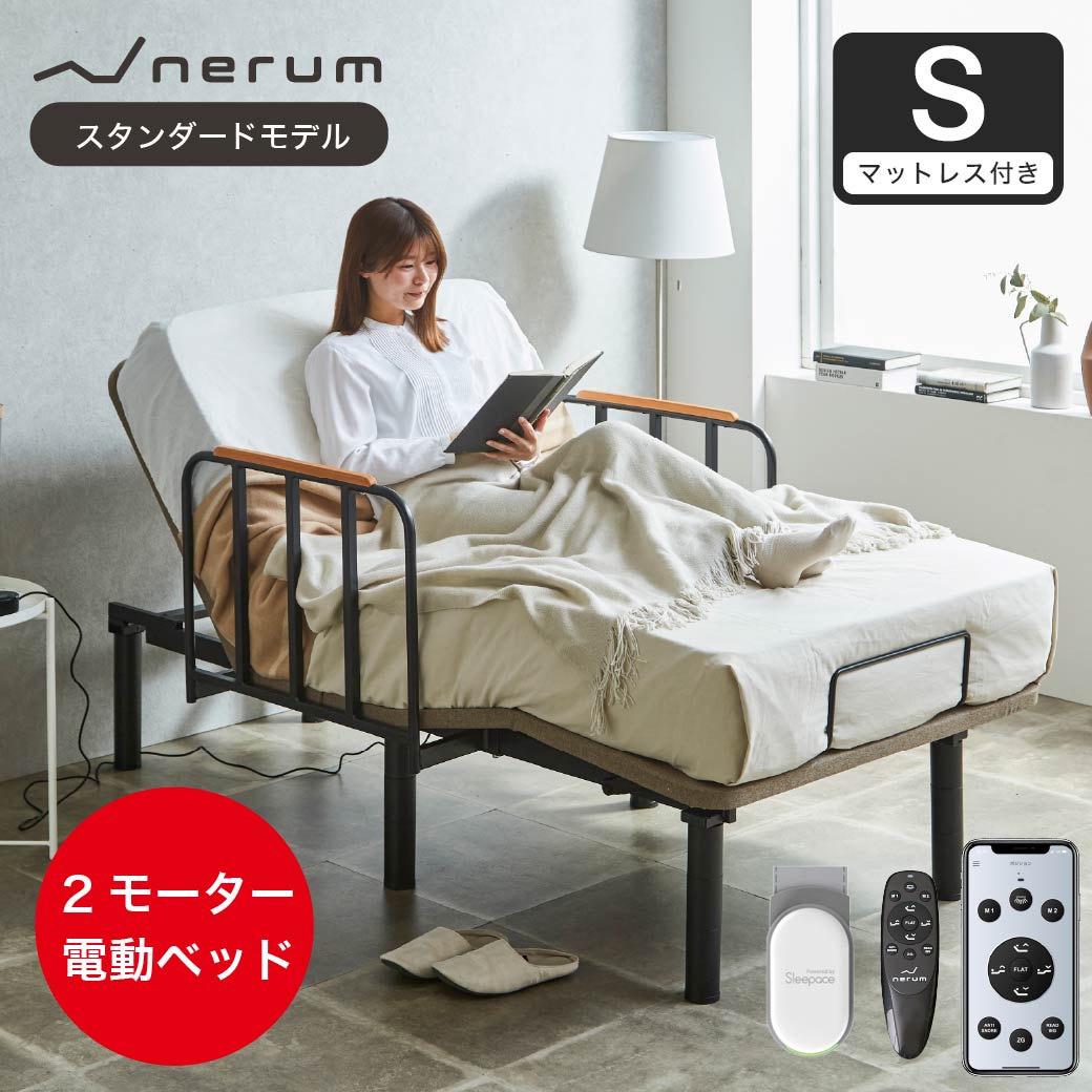 | 静音設計・2モーター内蔵!アプリ対応のアジャスタブル電動リクライニングベッドnerumapp。・専用リモコン、またはお手持ちの対応可能なOSが入ったスマホやタブレットでも頭、脚の上下リクライニング操作が可能です。・無重力ポジションやいびき防止や読書ポジションの他、自分の好きなポジションを記憶させることが可能なじぶんポジション機能があります。・脚部は2段階高さ調整ができ、安心のロースタイルからソファーのような高さまでマットレスの厚みやライフスタイルに合わせて調整可能です。・床板は通気性と耐久性に優れた、スチール・メッシュ仕様です。・リクライニング中に障害物が挟まった場合、モーターの力が加わらない、安全性の高い構造になっています。・脚を調整する事で3段階に高さ調整ができ、折り畳み収納も可能です。(バネ式ではありません)※専用リモコン用に別途単4電池が2本必要となります。電池は付属しておりませんのでご用意ください。 ■保証期間:1年 ■サイズ(約):幅97×奥行195×高さ40.7cm 【ベッド本体外寸】床面高さ20・22.7・29・31.7・40.7cm ベッド下高さ(5段階) 10・12.7・19・21.7・30.7cm 調節可能角度(約):【頭部】65°±2°【脚部】35°±2° 脚部:直径6cm ガード部分寸法(約):横幅670× 高さ445mm ※ベッドフレーム取り付けアーム部分は含まず。 【マットレス】幅97×長さ195×高さ20cm ■材 質:【ベッド本体】 スチール(粉体塗装) 床面部:ポリエステル100% 【サイドガード】 スチール(粉体塗装)、天然木 【マットレス】 表面生地:ニット織/側面生地:3Dメッシュ (ポリエステル100%)/ 中材:ポケットコイル、ウレタン、白色ピュアフェルト※衛生・コンパクト、圧縮梱包でお届けいたします。 ■耐荷重(約):180kg ■組 立:フレーム:お客様組立(大人2名:約45分) ■生産国:中国製(商品およびモーター規格設計ドイツ)、マットレス中国 ■梱 包:計3個口:電動ベッド:102×100×13cm(43.5kg)、サイドガード:78.5×60.5×24.5cm(11.1kg)、マットレス ■備考:コードの長さ(約):4m(電源BOX含む) 音声センサーコードの長さ(約):2.4m ※本体折り畳みについて ・他社製品のバネ式による折りたたみ式ではありません。 ・ベッドを組み立てる場合、ボルトとワッシャーの取り付けが必要です。 ・ベッドを折りたたむ場合、ボルトとワッシャーの取り外しが必要です。 ※納期表示の異なる商品を同時に購入した場合、納期の遅い商品とまとめて発送する場合がございます。予めご了承ください。 | ||||